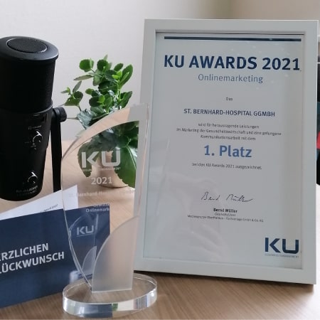 Für unser innovatives Kommunikationsformat „Krankenhausgeflüster“ wurde das St. Bernhard-Hospital mit dem renommierten KU-Award 2021 in der Kategorie Onlinemarketing ausgezeichnet. In dem monatlich erscheinenden Podcast geben Mitarbeitende authentische Einblicke in ihren Berufsalltag – nahbar, emotional und informativ. Ziel ist es, Vorurteile abzubauen, Transparenz zu schaffen und das Gesundheitswesen erlebbar zu machen.