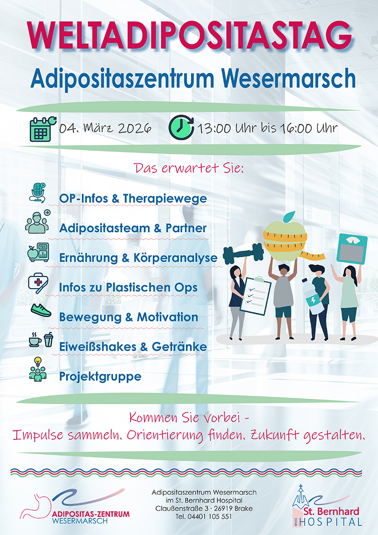 Anlässlich des Weltadipositastages am Dienstag, 4. März 2026, lädt das zertifizierte Adipositaszentrum Wesermarsch im St. Bernhard-Hospital Brake zu einem Informationstag ein. Von 13:00 bis 16:00 Uhr erhalten Betroffene, Angehörige sowie Fachpublikum umfassende Einblicke in das Krankheitsbild Adipositas, moderne Therapieverfahren und begleitende Unterstützungsangebote.